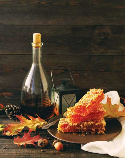 Most mead- and winemakers add fermentation enhancements to the “must” (unfermented mead or wine). These include tannins, acids, and nutrients added in very small amounts to help provide a well-rounded flavor. You can purchase these pre-made in powdered form at a homebrew store, but natural, unprocessed ingredients can be used as well. Tannins, which provide astringency, can be obtained from oak and walnut leaves, grape leaves, grape pips and skins, and many other botanicals. For acid, a squeeze of any citrus fruit will do. Nutrients provide additional nutrition for the yeast to feed on, so that they don’t stress themselves and produce off flavors. Unfiltered honey with large amounts of hive residue works well for this, as does bee pollen. Meads with fruits or other botanicals will need little to no additional nutrients, but to be on the safe side, you can always purchase a wine nutrient, such as Fermaid K or Fermaid O (the latter is Certified Organic).